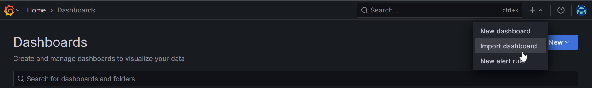 You can also use the Grafana Dashboard that has been created for TriliumNext - just take the JSON from grafana-dashboard.json and then import the dashboard, following these screenshots: